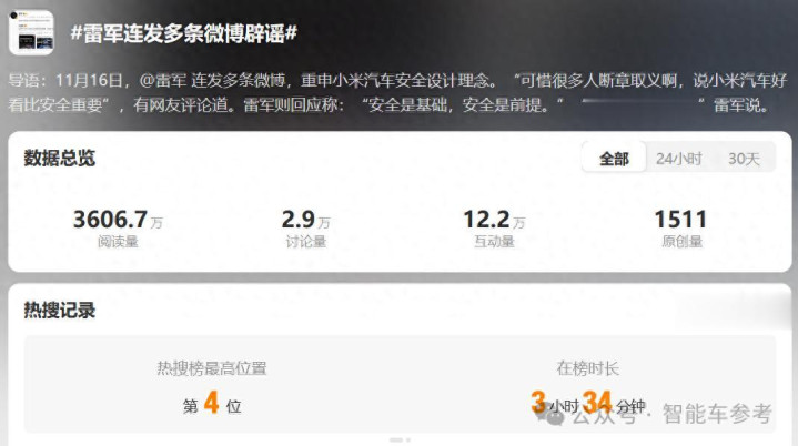 事发突然,雷军在微博上连发三条微博,公开回应了网络上有关小米汽车“安全和好看第一性”的质疑,认为部分舆论是断章取义。