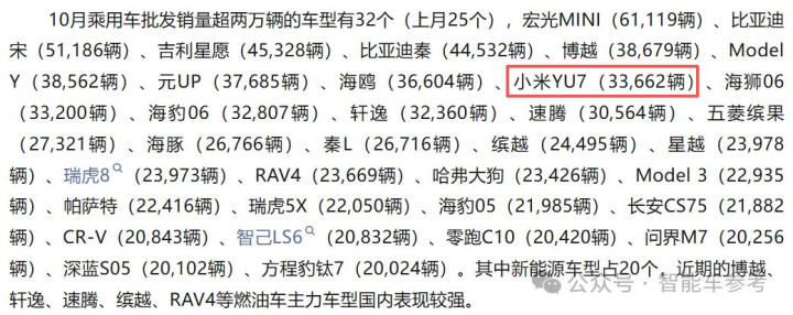 其中,10月小米SU7的销量为14992辆,小米YU7为33662辆。