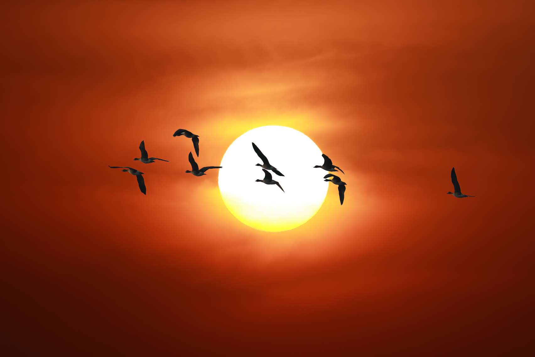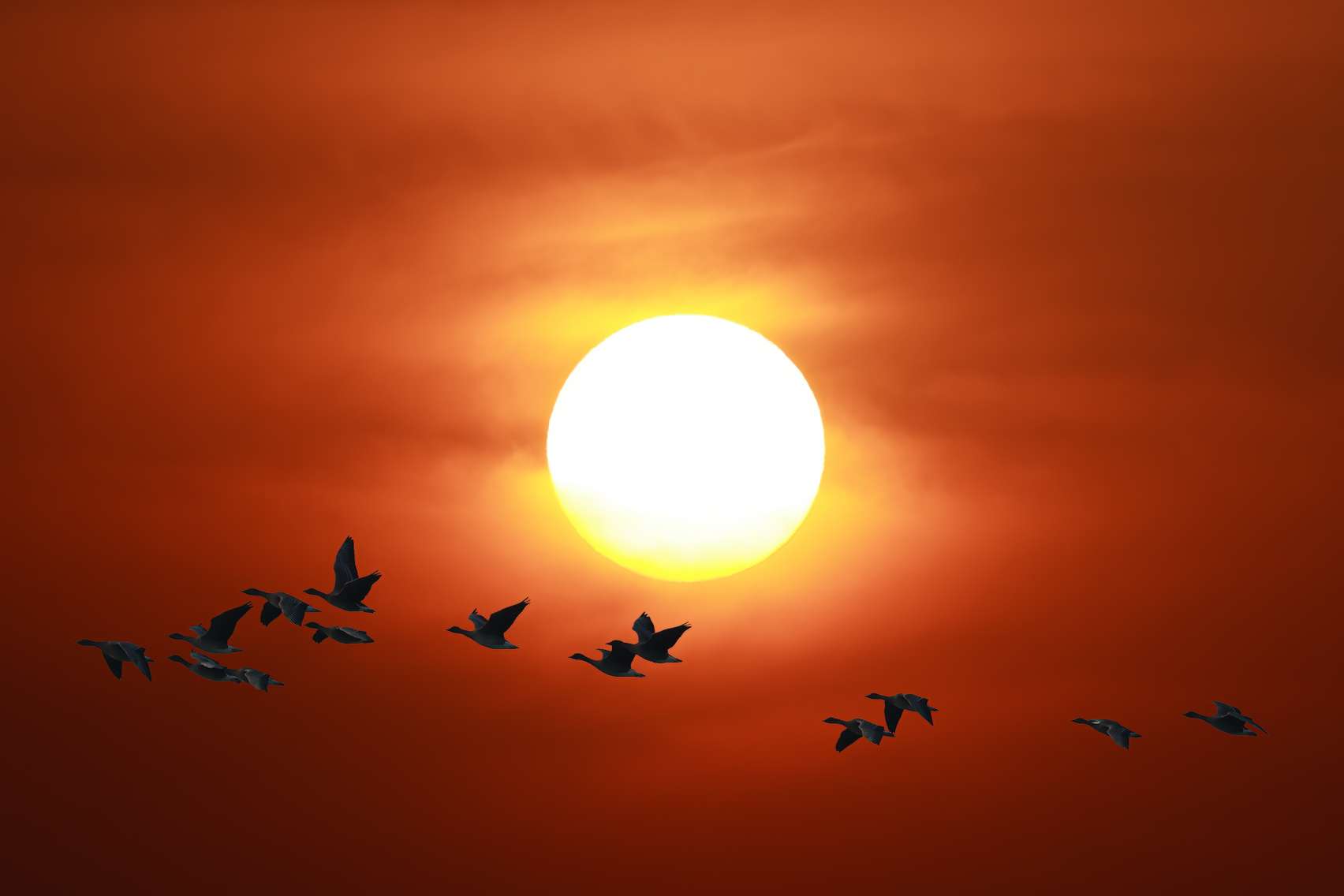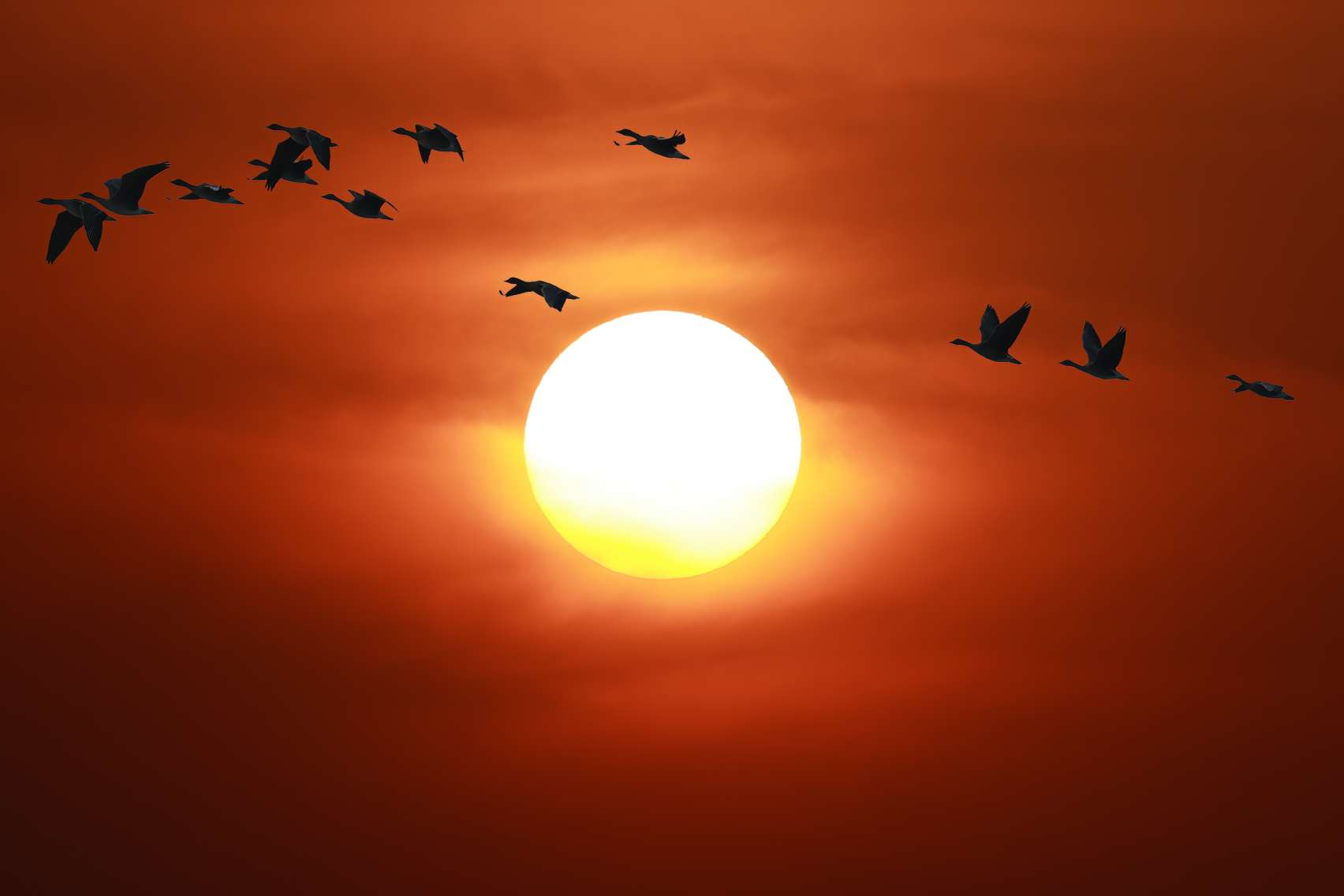 落日为整个天空泼洒下暖金色的基调,或橙或紫,宛如一块巨大的、渐变的画布。逆光之下,大雁的轮廓被勾勒成深邃的剪影,如同飞翔的墨迹,在辉煌的背景上书写着流动的诗行。